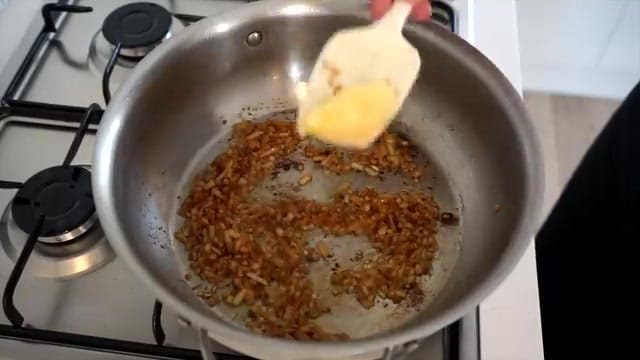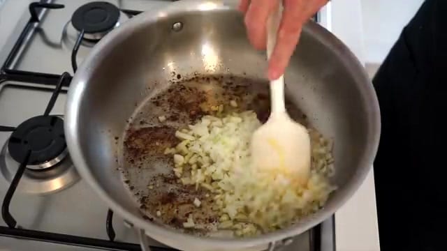 Set aside. In the same pan, melt clarified butter, then sauté the diced onion for three minutes until translucent.