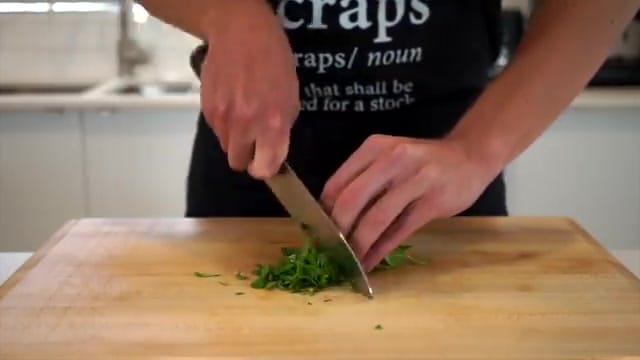 For herbs, we’ll roughly chop 10 grams of fresh basil.