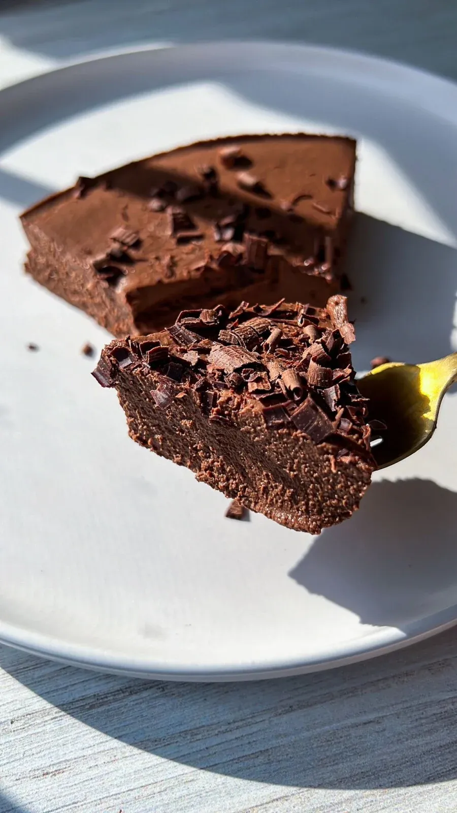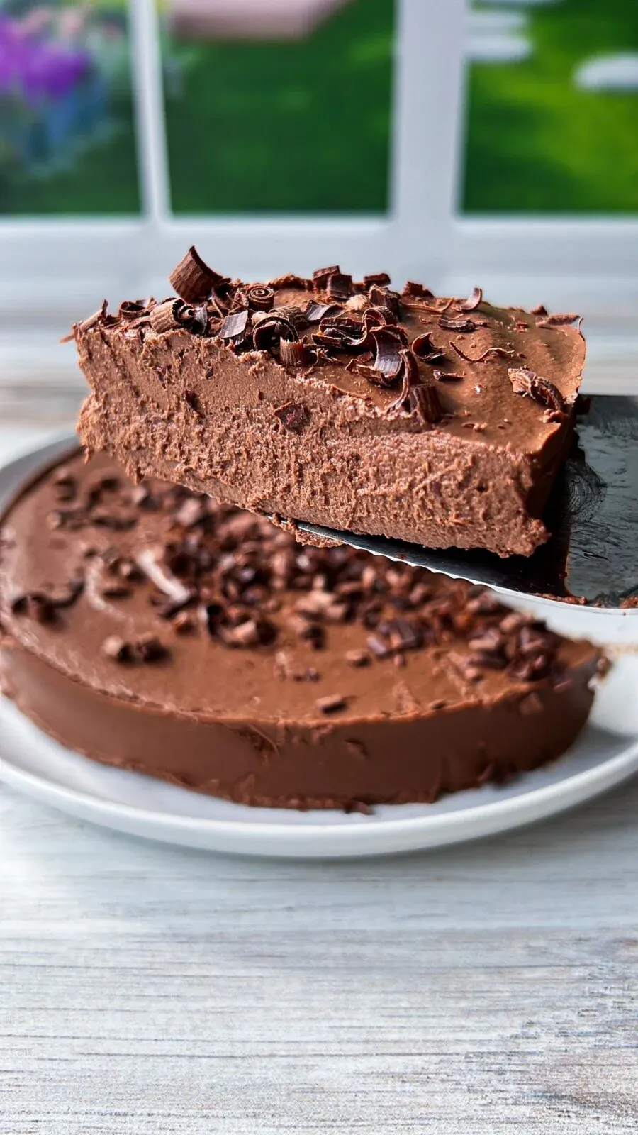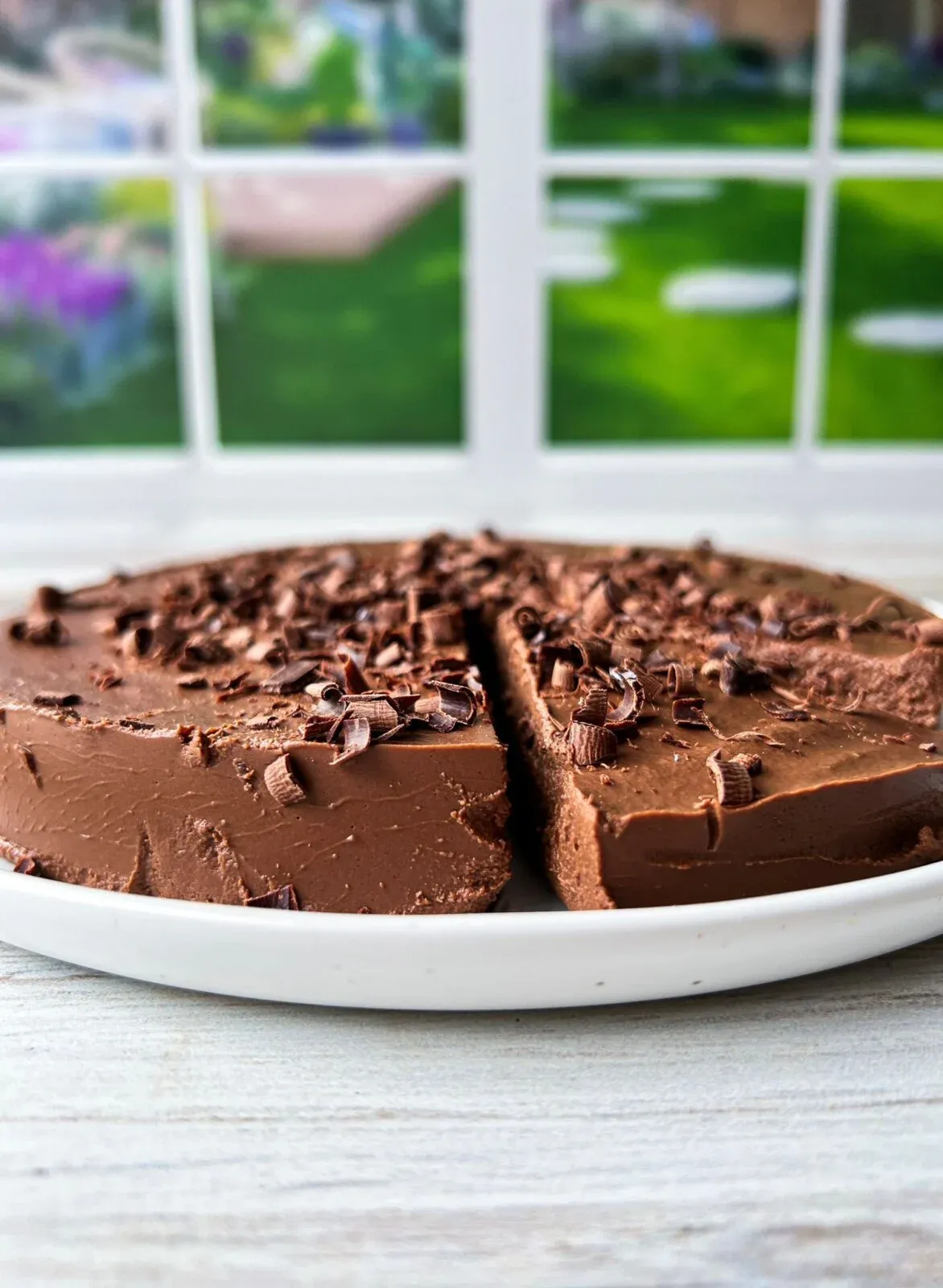 Let the cake set in the fridge. Once it’s firm, top with chocolate shavings if you like.