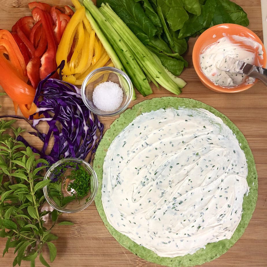 Grab a tortilla and place it on your cutting board. Spread a thin layer of the herbed cream cheese, leaving about an inch around the edge.