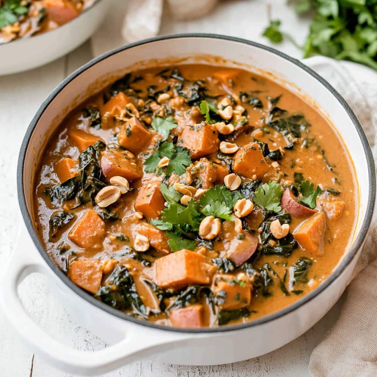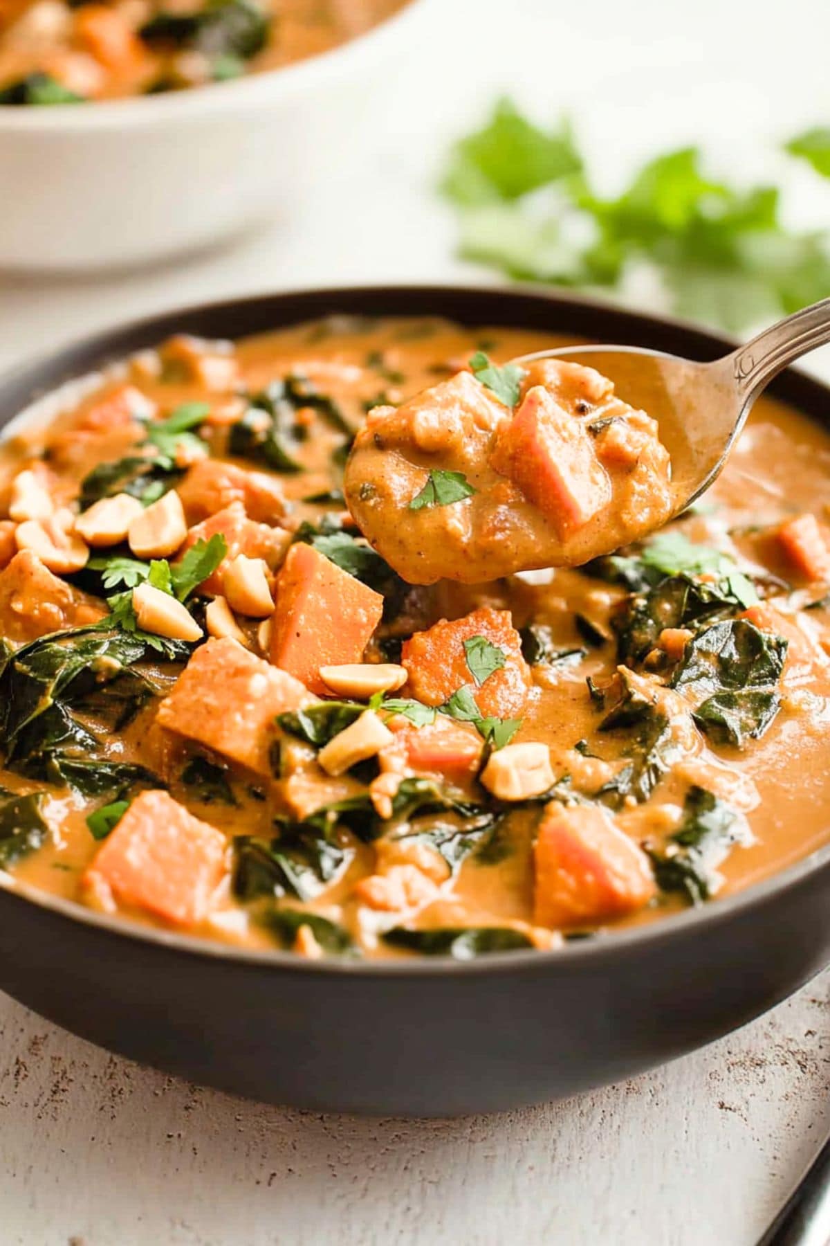 You’ll love the rich, creamy texture from the peanut butter. The recipe is flexible too. You can use chicken or vegetable broth, and swap in different greens like collards or kale. Top it with roasted peanuts and cilantro for extra crunch and flavor.