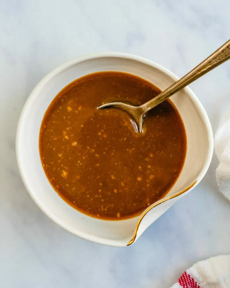 This sauce is made with soy sauce, sesame oil, rice vinegar, garlic, ginger, red pepper flakes and brown sugar. Delicious!