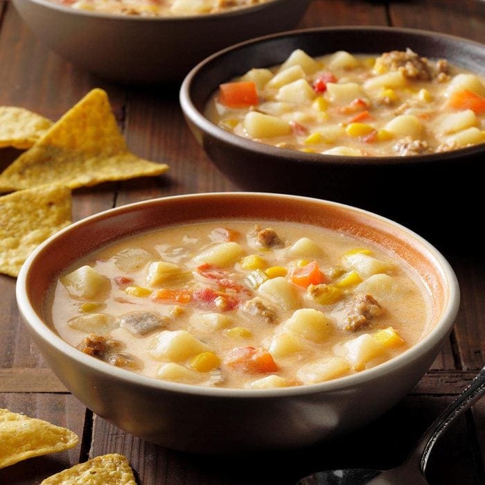 This is a turned-up version of a cheesy potato soup. We eat this often, especially on cold winter evenings, but it’d be lovely for family get-togethers or potlucks during the holidays! Crushed red pepper flakes really turn up the heat. —Angela Sheridan, Opdyke, IllinoisCheck out this recipe195